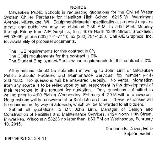Share: Click to share on Facebook (Opens in new window) Facebook Tweet Click to email a link to a friend (Opens in new window) Email Click to print (Opens in new window) Print MPS Requesting Quotations for Chilled Water System Chiller Purchase February 6, 2015 Share: Click to share on Facebook (Opens in new window) Facebook Tweet Click to email a link to a friend (Opens in new window) Email Click to print (Opens in new window) Print