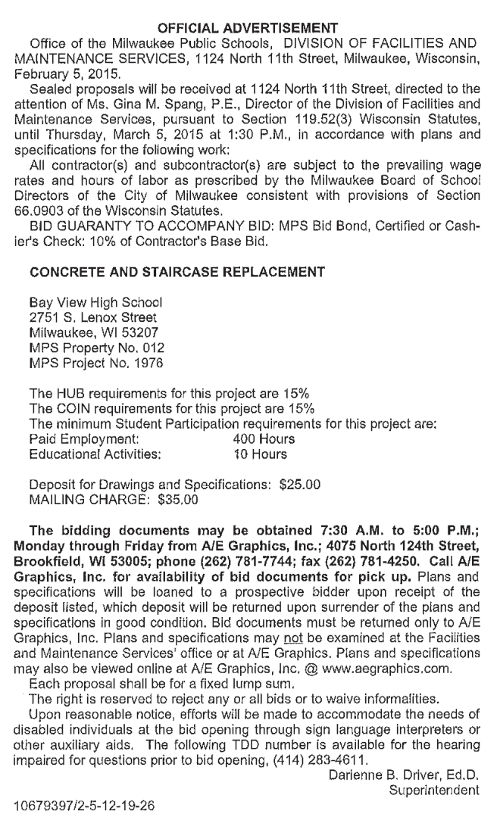Share: Click to share on Facebook (Opens in new window) Facebook Tweet Click to email a link to a friend (Opens in new window) Email Click to print (Opens in new window) Print MPS Requesting BIDs for Concrete and Staircase Replacement at Bay View High School February 14, 2015 Share: Click to share on Facebook (Opens in new window) Facebook Tweet Click to email a link to a friend (Opens in new window) Email Click to print (Opens in new window) Print