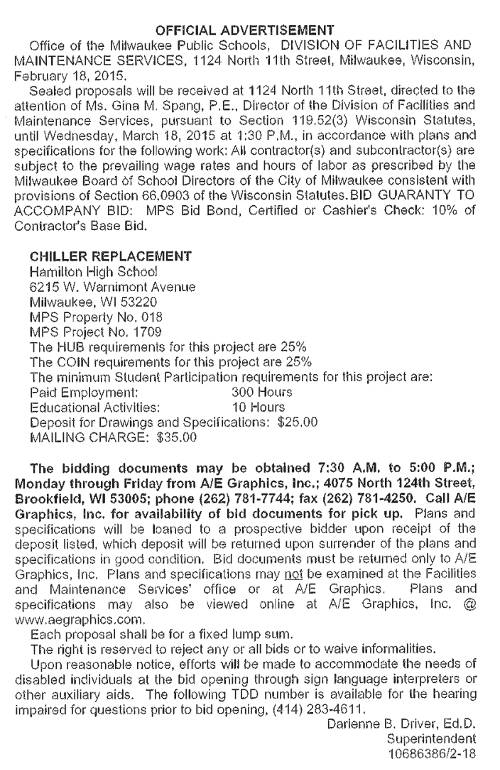 Share: Click to share on Facebook (Opens in new window) Facebook Tweet Click to email a link to a friend (Opens in new window) Email Click to print (Opens in new window) Print MPS Requesting BIDs for Chiller Replacement at Hamilton High School February 21, 2015 Share: Click to share on Facebook (Opens in new window) Facebook Tweet Click to email a link to a friend (Opens in new window) Email Click to print (Opens in new window) Print