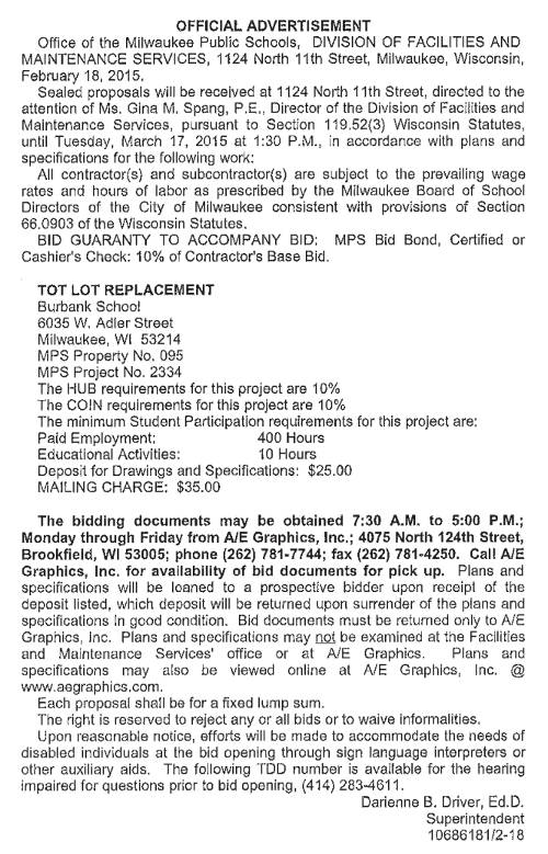 Share: Click to share on Facebook (Opens in new window) Facebook Tweet Click to email a link to a friend (Opens in new window) Email Click to print (Opens in new window) Print MPS Requesting BIDs for Tot Lot Replacement at Burbank School February 21, 2015 Share: Click to share on Facebook (Opens in new window) Facebook Tweet Click to email a link to a friend (Opens in new window) Email Click to print (Opens in new window) Print