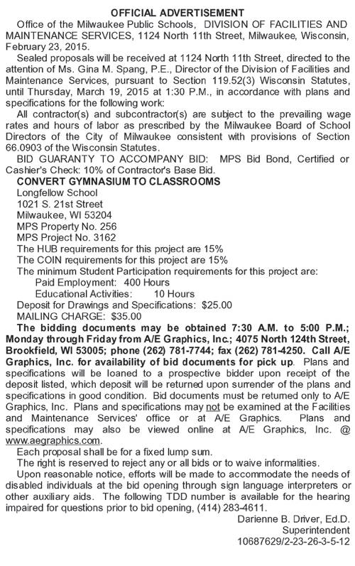 Share: Click to share on Facebook (Opens in new window) Facebook Tweet Click to email a link to a friend (Opens in new window) Email Click to print (Opens in new window) Print MPS Requesting BIDs for Convert Gymnasium to Classrooms at Longfellow Middle School February 27, 2015 Share: Click to share on Facebook (Opens in new window) Facebook Tweet Click to email a link to a friend (Opens in new window) Email Click to print (Opens in new window) Print