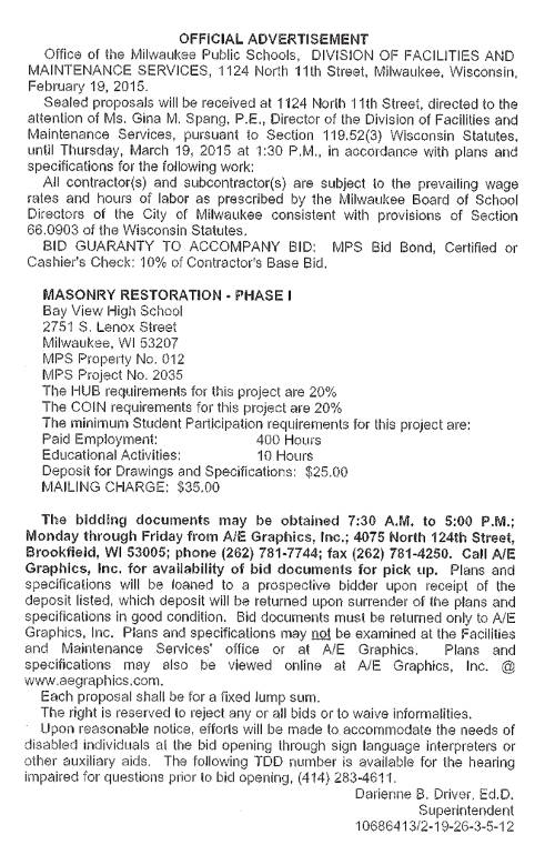 Share: Click to share on Facebook (Opens in new window) Facebook Tweet Click to email a link to a friend (Opens in new window) Email Click to print (Opens in new window) Print MPS Requesting BIDs for Masonry Restoration at Bay View High School February 27, 2015 Share: Click to share on Facebook (Opens in new window) Facebook Tweet Click to email a link to a friend (Opens in new window) Email Click to print (Opens in new window) Print