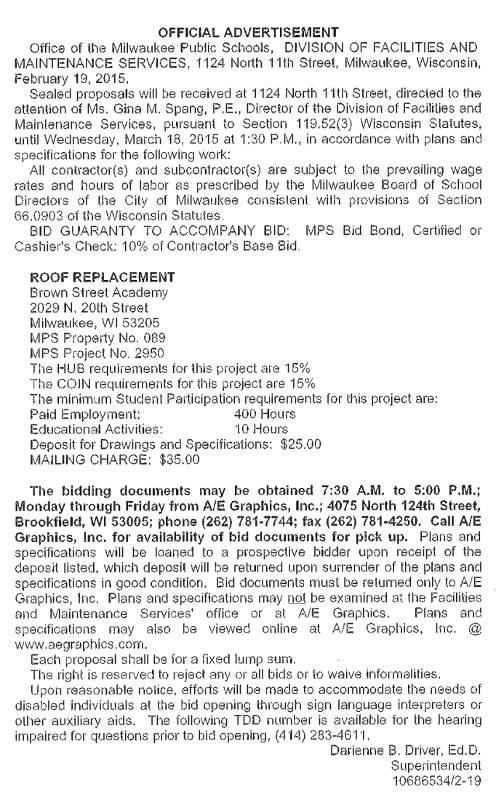 Share: Click to share on Facebook (Opens in new window) Facebook Tweet Click to email a link to a friend (Opens in new window) Email Click to print (Opens in new window) Print MPS Requesting BIDs for Roof Replacement at Brown Street Academy February 27, 2015 Share: Click to share on Facebook (Opens in new window) Facebook Tweet Click to email a link to a friend (Opens in new window) Email Click to print (Opens in new window) Print