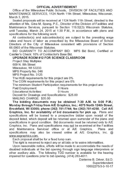 Share: Click to share on Facebook (Opens in new window) Facebook Tweet Click to email a link to a friend (Opens in new window) Email Click to print (Opens in new window) Print MPS Requesting BIDs for Upgrade Room 12 for Science Classroom at Project Stay Multiplex March 7, 2015 Share: Click to share on Facebook (Opens in new window) Facebook Tweet Click to email a link to a friend (Opens in new window) Email Click to print (Opens in new window) Print