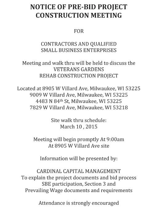 Share: Click to share on Facebook (Opens in new window) Facebook Tweet Click to email a link to a friend (Opens in new window) Email Click to print (Opens in new window) Print Pre-bid Project Construction Meeting for Veterans Gardens Rehab Project March 7, 2015 Share: Click to share on Facebook (Opens in new window) Facebook Tweet Click to email a link to a friend (Opens in new window) Email Click to print (Opens in new window) Print