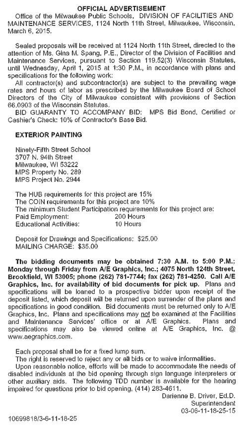 Share: Click to share on Facebook (Opens in new window) Facebook Tweet Click to email a link to a friend (Opens in new window) Email Click to print (Opens in new window) Print MPS Requesting BIDs for Exterior Painting at Ninety-Fifth Street School March 14, 2015 Share: Click to share on Facebook (Opens in new window) Facebook Tweet Click to email a link to a friend (Opens in new window) Email Click to print (Opens in new window) Print
