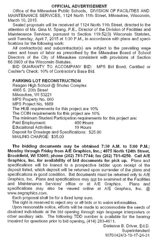 Share: Click to share on Facebook (Opens in new window) Facebook Tweet Click to email a link to a friend (Opens in new window) Email Click to print (Opens in new window) Print MPS Requesting BIDs for Parking Lot Reconstruction at Raegan High School March 14, 2015 Share: Click to share on Facebook (Opens in new window) Facebook Tweet Click to email a link to a friend (Opens in new window) Email Click to print (Opens in new window) Print
