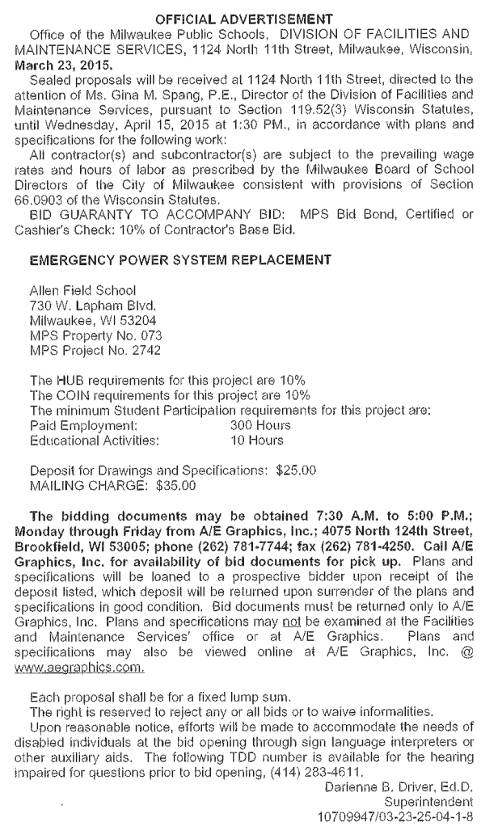 Share: Click to share on Facebook (Opens in new window) Facebook Tweet Click to email a link to a friend (Opens in new window) Email Click to print (Opens in new window) Print MPS Requesting BIDs for Emergency Power System Replacement at Allen Field School March 28, 2015 Share: Click to share on Facebook (Opens in new window) Facebook Tweet Click to email a link to a friend (Opens in new window) Email Click to print (Opens in new window) Print