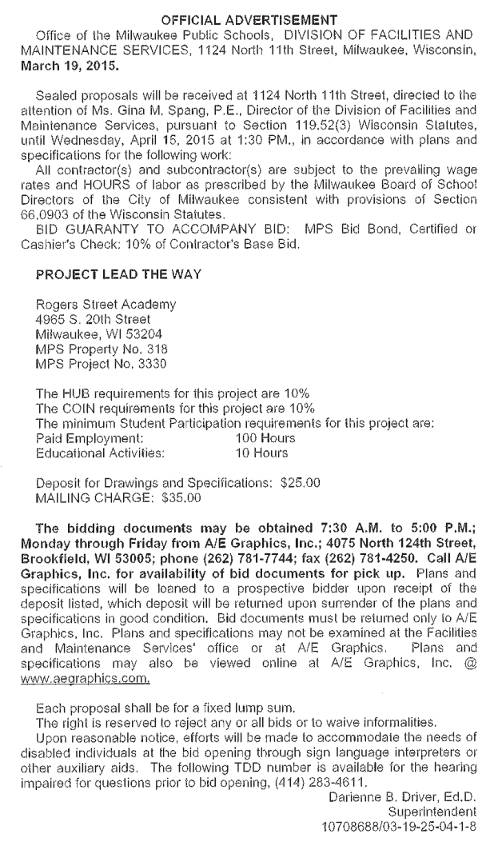 Share: Click to share on Facebook (Opens in new window) Facebook Tweet Click to email a link to a friend (Opens in new window) Email Click to print (Opens in new window) Print MPS Requesting BIDs for Project Lead The Way at Rogers Street Academy March 28, 2015 Share: Click to share on Facebook (Opens in new window) Facebook Tweet Click to email a link to a friend (Opens in new window) Email Click to print (Opens in new window) Print