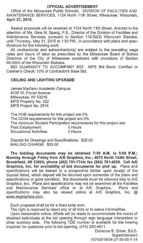 Share: Click to share on Facebook (Opens in new window) Facebook Tweet Click to email a link to a friend (Opens in new window) Email Click to print (Opens in new window) Print MPS Requesting BIDs for Ceiling and Lighting Upgrade at James Madison Academic Campus May 1, 2015 Share: Click to share on Facebook (Opens in new window) Facebook Tweet Click to email a link to a friend (Opens in new window) Email Click to print (Opens in new window) Print