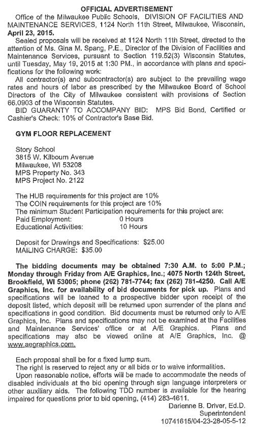 Share: Click to share on Facebook (Opens in new window) Facebook Tweet Click to email a link to a friend (Opens in new window) Email Click to print (Opens in new window) Print MPS Requesting BIDs for Gym Floor Replacement at Story School May 1, 2015 Share: Click to share on Facebook (Opens in new window) Facebook Tweet Click to email a link to a friend (Opens in new window) Email Click to print (Opens in new window) Print