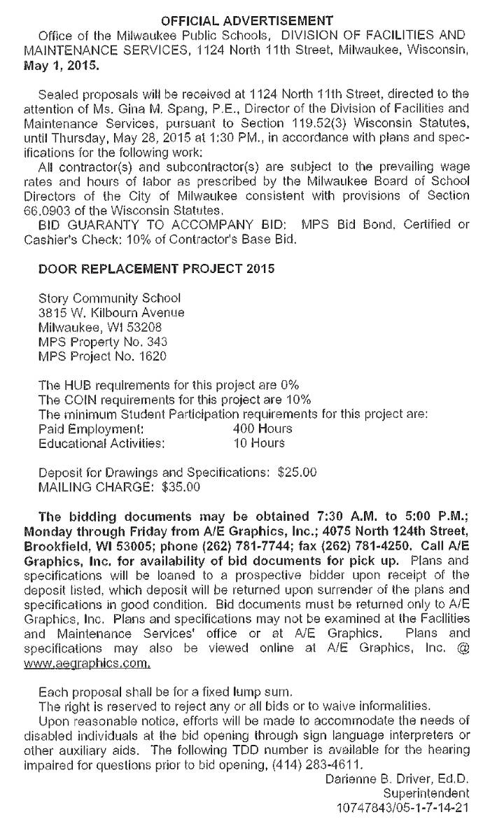 Share: Click to share on Facebook (Opens in new window) Facebook Tweet Click to email a link to a friend (Opens in new window) Email Click to print (Opens in new window) Print MPS Requesting BIDs for Door Replacement Project 2015 at Story Community School May 9, 2015 Share: Click to share on Facebook (Opens in new window) Facebook Tweet Click to email a link to a friend (Opens in new window) Email Click to print (Opens in new window) Print