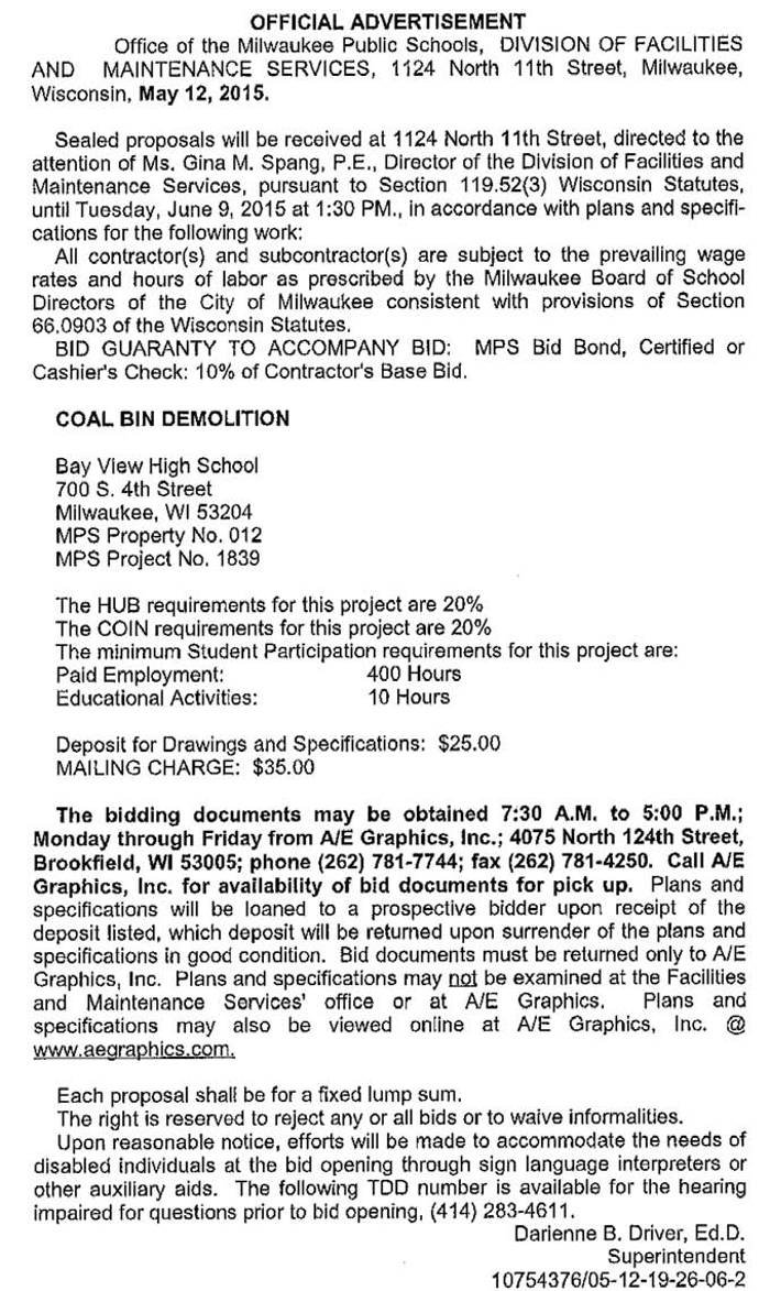 Share: Click to share on Facebook (Opens in new window) Facebook Tweet Click to email a link to a friend (Opens in new window) Email Click to print (Opens in new window) Print MPS Requesting BIDs for Coal Bin Demolition at Bay View High School May 16, 2015 Share: Click to share on Facebook (Opens in new window) Facebook Tweet Click to email a link to a friend (Opens in new window) Email Click to print (Opens in new window) Print