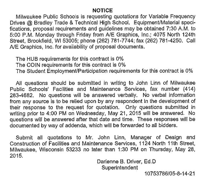 Share: Click to share on Facebook (Opens in new window) Facebook Tweet Click to email a link to a friend (Opens in new window) Email Click to print (Opens in new window) Print MPS Requesting Quotations for Variable Frequency Drives at Bradley Tech High School May 16, 2015 Share: Click to share on Facebook (Opens in new window) Facebook Tweet Click to email a link to a friend (Opens in new window) Email Click to print (Opens in new window) Print