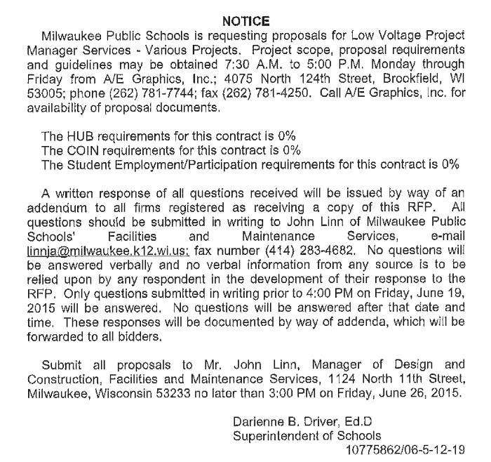 Share: Click to share on Facebook (Opens in new window) Facebook Tweet Click to email a link to a friend (Opens in new window) Email Click to print (Opens in new window) Print MPS Requesting Proposals for Low Voltage Project Manager Services June 13, 2015 Share: Click to share on Facebook (Opens in new window) Facebook Tweet Click to email a link to a friend (Opens in new window) Email Click to print (Opens in new window) Print