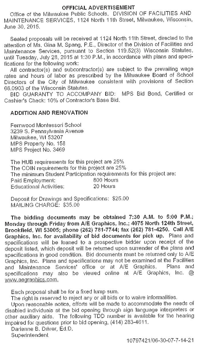 Share: Click to share on Facebook (Opens in new window) Facebook Tweet Click to email a link to a friend (Opens in new window) Email Click to print (Opens in new window) Print MPS Requesting BIDs for Addition and Renovation at Fernwood Montessori School July 4, 2015 Share: Click to share on Facebook (Opens in new window) Facebook Tweet Click to email a link to a friend (Opens in new window) Email Click to print (Opens in new window) Print