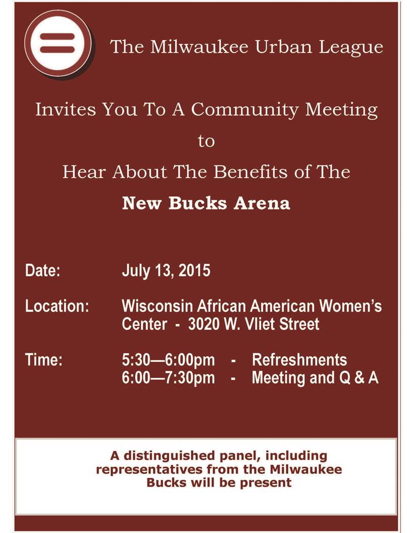 Share: Click to share on Facebook (Opens in new window) Facebook Tweet Click to email a link to a friend (Opens in new window) Email Click to print (Opens in new window) Print Community Meeting On Benefits of New Bucks Arena July 11, 2015 Share: Click to share on Facebook (Opens in new window) Facebook Tweet Click to email a link to a friend (Opens in new window) Email Click to print (Opens in new window) Print