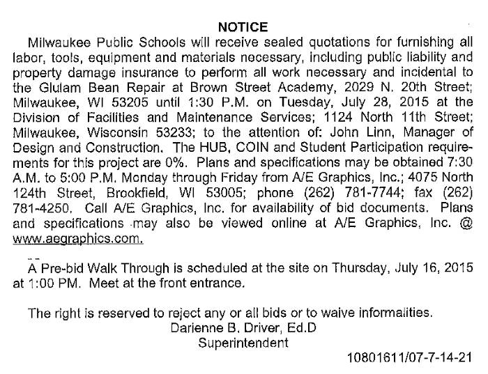 Share: Click to share on Facebook (Opens in new window) Facebook Tweet Click to email a link to a friend (Opens in new window) Email Click to print (Opens in new window) Print MPS Requesting Quotations for Glulam Bean Repair at Brown Street Academy July 11, 2015 Share: Click to share on Facebook (Opens in new window) Facebook Tweet Click to email a link to a friend (Opens in new window) Email Click to print (Opens in new window) Print