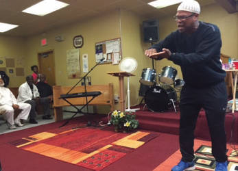 Spoken word artist Muhibb Dyer giving an impromptu performance at a memorial service for Taki S. Raton.