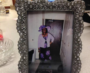 A framed photo sits on Washington-Murray’s desk. It shows her mother, Sylvia Washington, dressed in her favorite color, purple. Photo by Dylan Deprey.