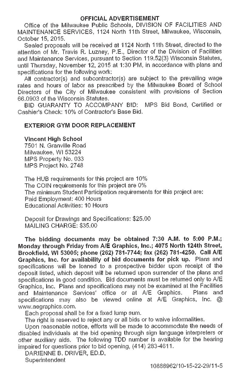 Share: Click to share on Facebook (Opens in new window) Facebook Tweet Click to email a link to a friend (Opens in new window) Email Click to print (Opens in new window) Print MPS Requesting BIDs for Exterior Door Replacement at Vincent High School October 17, 2015 Share: Click to share on Facebook (Opens in new window) Facebook Tweet Click to email a link to a friend (Opens in new window) Email Click to print (Opens in new window) Print