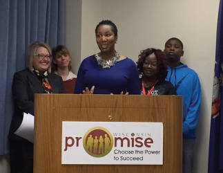From left to right: DWD Deputy Secretary Georgia Maxwell, CEO Employment Consultant Stephanie Bostedt, President at Our Next Generation, Inc., La Toya Sykes, Wisconsin Promise participant Diane Cook, and her son Derek.