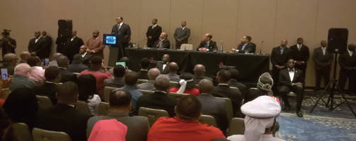 Minister Louis Farrakhan meets with members of the 100 Black Men on Sunday, Oct. 11, the day after thousands convened on the Washington Mall to commemorate the 20th Anniversary of the Million Man March. Farrakhan and Thomas Dortch, chairman emeritus of the 100 Black Men, say they will recruit 10,000 men and 10,000 women to work to improve the Black community. PHOTO: Roy Lewis/Trice Edney News Wire
