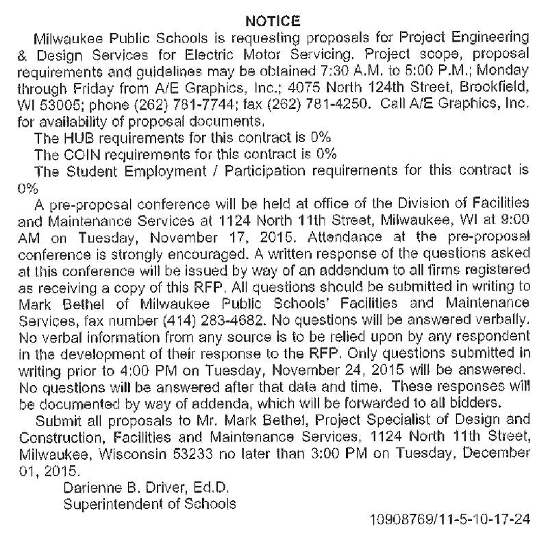 Share: Click to share on Facebook (Opens in new window) Facebook Tweet Click to email a link to a friend (Opens in new window) Email Click to print (Opens in new window) Print MPS Requesting Proposals for Project Engineering & Design Services for Electric Motor Servicing November 13, 2015 Share: Click to share on Facebook (Opens in new window) Facebook Tweet Click to email a link to a friend (Opens in new window) Email Click to print (Opens in new window) Print