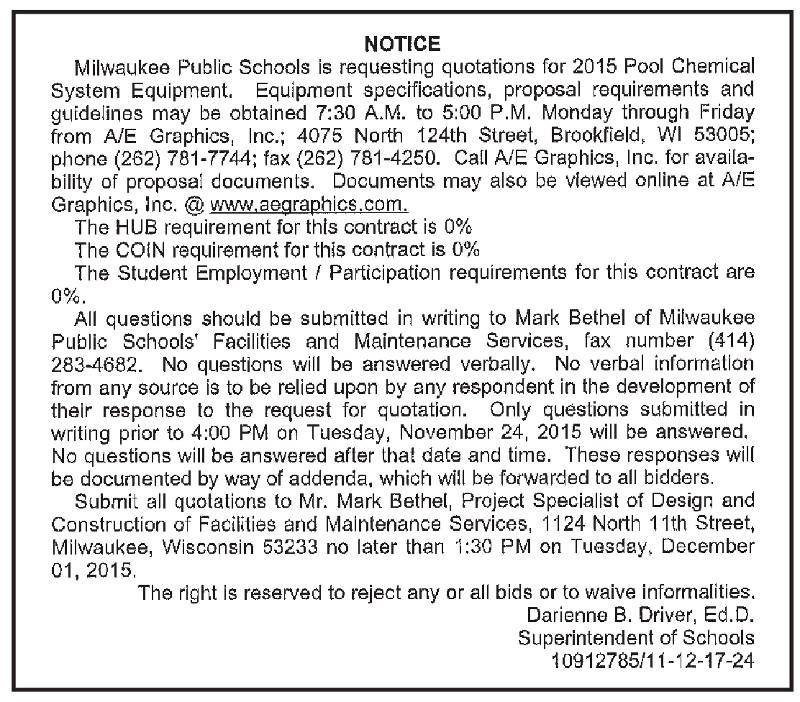 Share: Click to share on Facebook (Opens in new window) Facebook Tweet Click to email a link to a friend (Opens in new window) Email Click to print (Opens in new window) Print MPS Requesting Quotations for 2015 Pool Chemical System Equipment November 21, 2015 Share: Click to share on Facebook (Opens in new window) Facebook Tweet Click to email a link to a friend (Opens in new window) Email Click to print (Opens in new window) Print