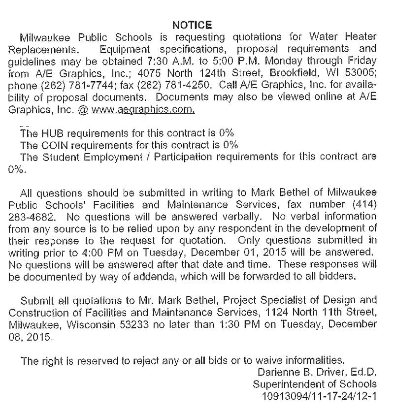 Share: Click to share on Facebook (Opens in new window) Facebook Tweet Click to email a link to a friend (Opens in new window) Email Click to print (Opens in new window) Print MPS Requesting Quotations for Water Heater Replacements November 21, 2015 Share: Click to share on Facebook (Opens in new window) Facebook Tweet Click to email a link to a friend (Opens in new window) Email Click to print (Opens in new window) Print
