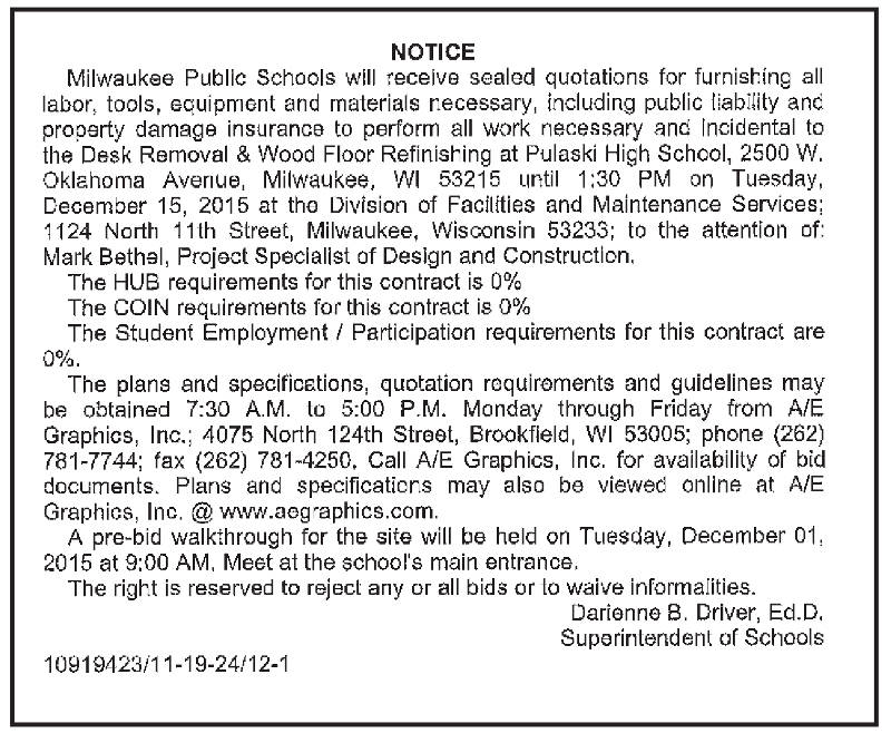 Share: Click to share on Facebook (Opens in new window) Facebook Tweet Click to email a link to a friend (Opens in new window) Email Click to print (Opens in new window) Print MPS Requesting Quotations for Desk Removal & Wood Floor Refinishing at Pulaski High School November 28, 2015 Share: Click to share on Facebook (Opens in new window) Facebook Tweet Click to email a link to a friend (Opens in new window) Email Click to print (Opens in new window) Print