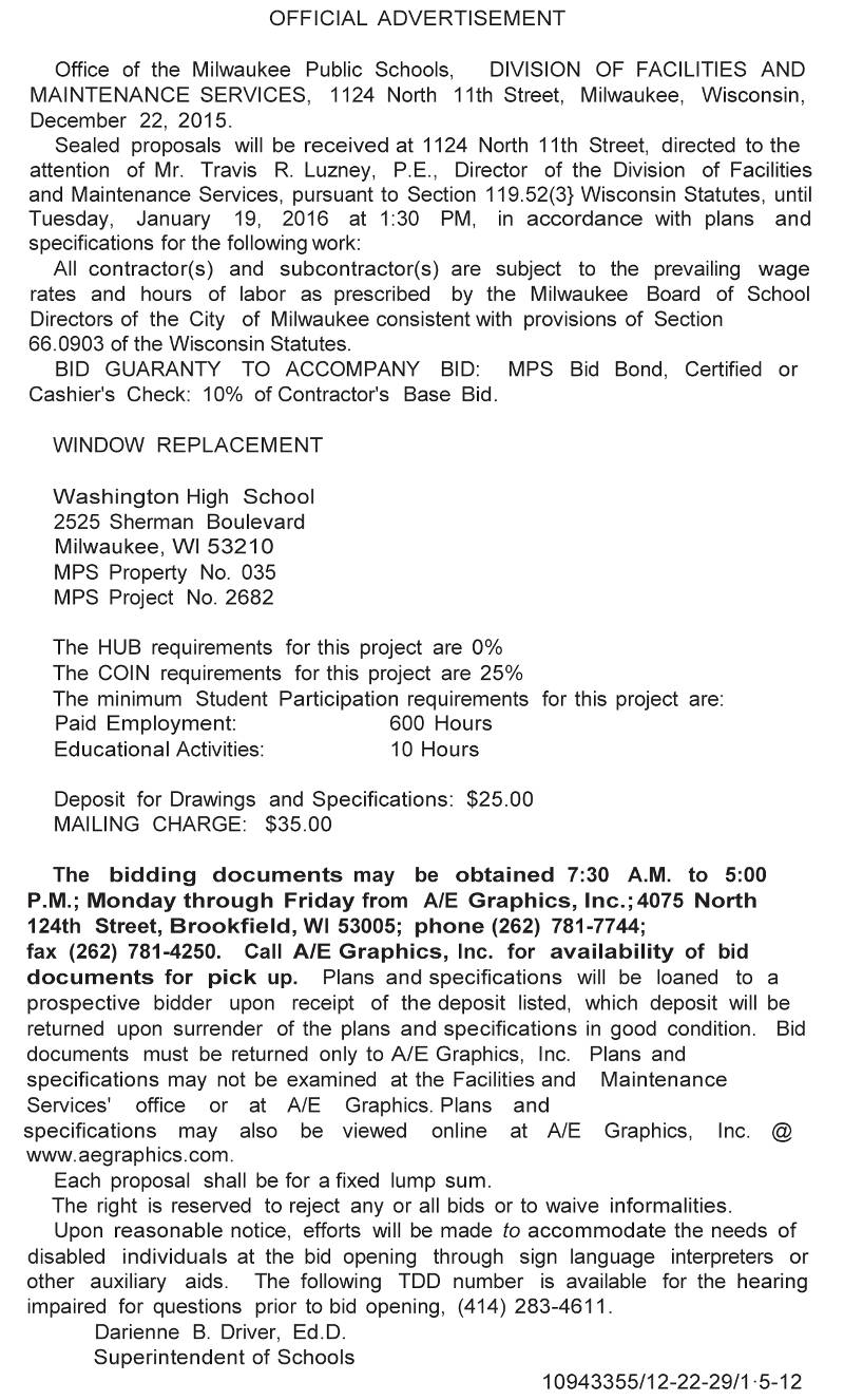 Share: Click to share on Facebook (Opens in new window) Facebook Tweet Click to email a link to a friend (Opens in new window) Email Click to print (Opens in new window) Print MPS Requesting BIDs for Window Replacement at Washington High School December 25, 2015 Share: Click to share on Facebook (Opens in new window) Facebook Tweet Click to email a link to a friend (Opens in new window) Email Click to print (Opens in new window) Print