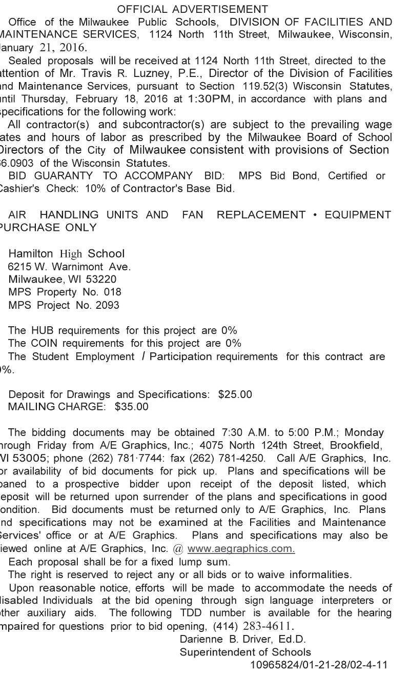 Share: Click to share on Facebook (Opens in new window) Facebook Tweet Click to email a link to a friend (Opens in new window) Email Click to print (Opens in new window) Print MPS Requesting BIDS for Air Handling Unit and Fan Replacement – Equipment Purchase Only – at Hamilton High School January 23, 2016 Share: Click to share on Facebook (Opens in new window) Facebook Tweet Click to email a link to a friend (Opens in new window) Email Click to print (Opens in new window) Print