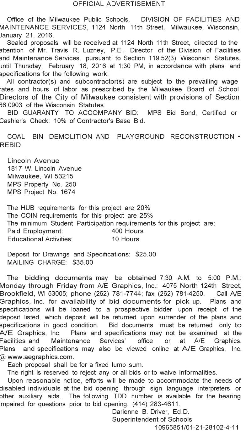 Share: Click to share on Facebook (Opens in new window) Facebook Tweet Click to email a link to a friend (Opens in new window) Email Click to print (Opens in new window) Print MPS Requesting BIDs for Coal Bin Demolition and Playground Reconstruction – Rebid at Lincoln Avenue January 23, 2016 Share: Click to share on Facebook (Opens in new window) Facebook Tweet Click to email a link to a friend (Opens in new window) Email Click to print (Opens in new window) Print