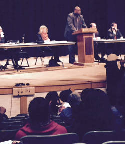 A standing room only crowd at Centennial Hall inside the Milwaukee Public Library Central location, 733 N 8th Street, had Milwaukee residents voicing concerns at a listening session hosted by Department of Justice (DOJ) representatives from Washington, D.C.