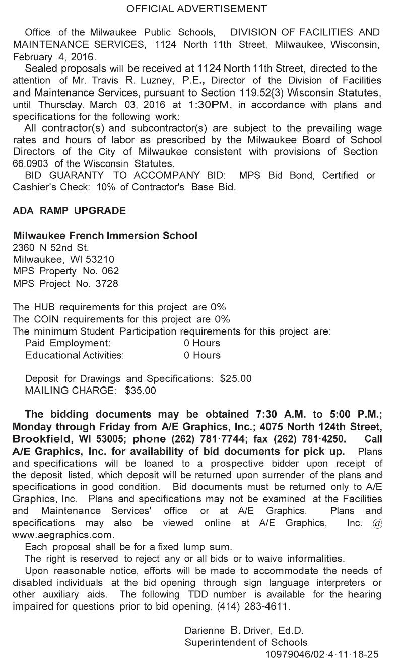 Share: Click to share on Facebook (Opens in new window) Facebook Tweet Click to email a link to a friend (Opens in new window) Email Click to print (Opens in new window) Print MPS Requesting BIDs for ADA Ramp Upgrade at Milwaukee French Immersion School February 12, 2016 Share: Click to share on Facebook (Opens in new window) Facebook Tweet Click to email a link to a friend (Opens in new window) Email Click to print (Opens in new window) Print