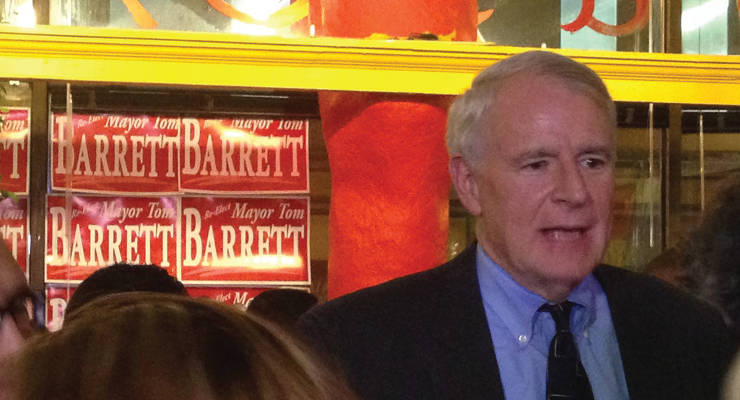 As the clock struck 8:57 p.m., applause caressed the walls of the room as Mayor Tom Barrett walked in.