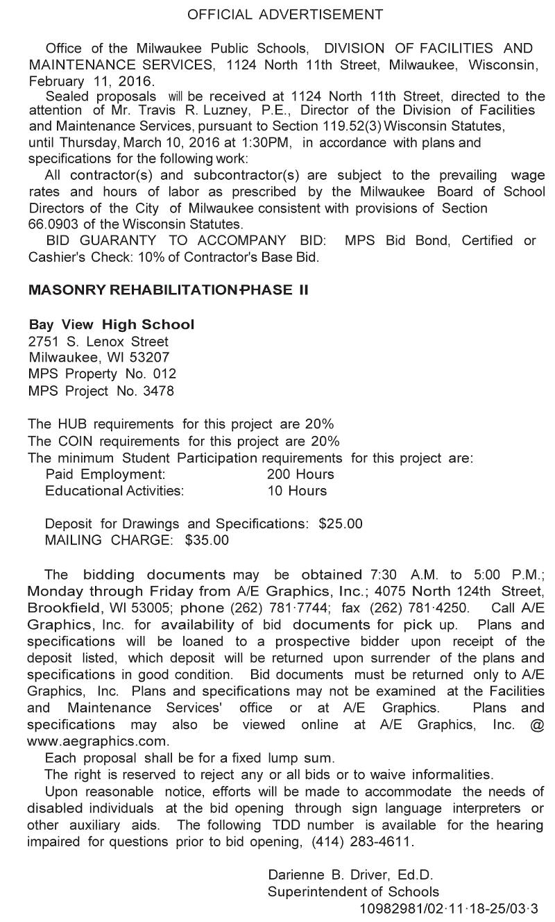 Share: Click to share on Facebook (Opens in new window) Facebook Tweet Click to email a link to a friend (Opens in new window) Email Click to print (Opens in new window) Print MPS Requesting BIDs for Masonry Rehabilitation Phase II at Bay View High School February 20, 2016 Share: Click to share on Facebook (Opens in new window) Facebook Tweet Click to email a link to a friend (Opens in new window) Email Click to print (Opens in new window) Print