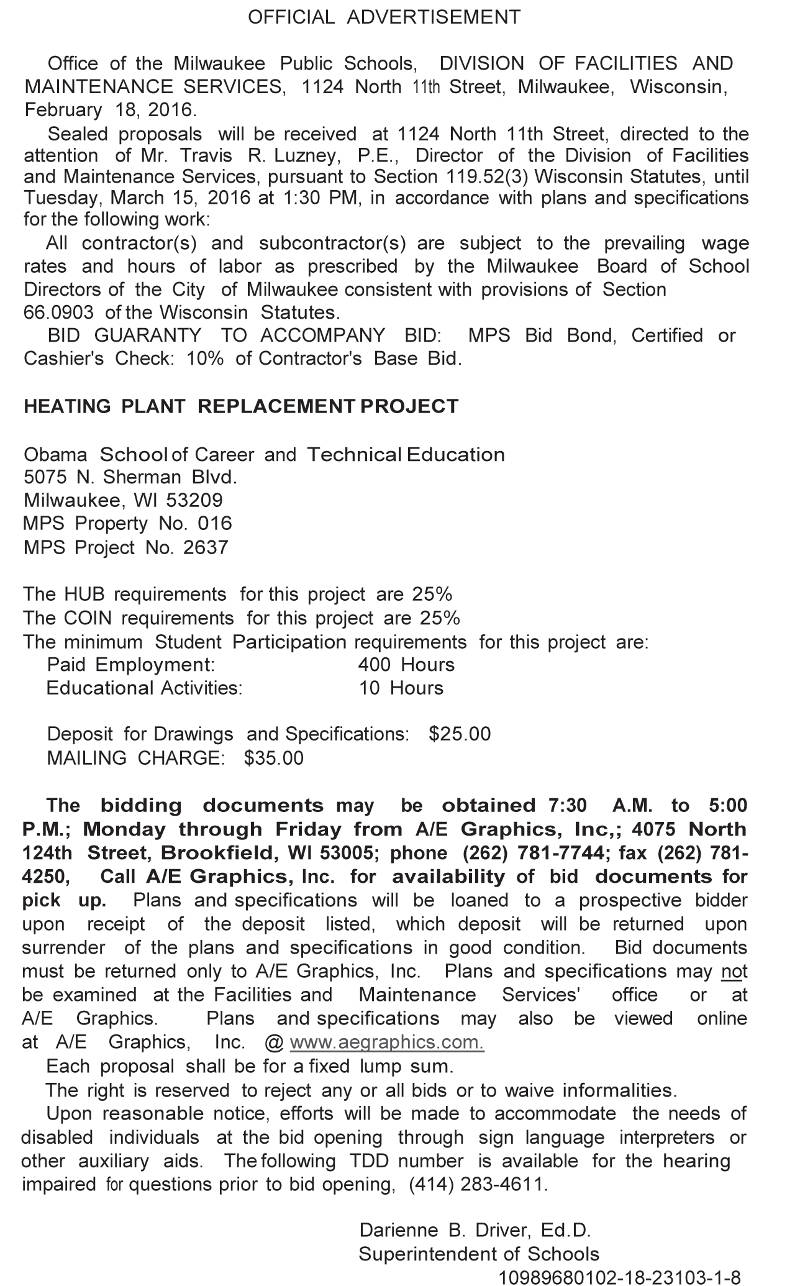 Share: Click to share on Facebook (Opens in new window) Facebook Tweet Click to email a link to a friend (Opens in new window) Email Click to print (Opens in new window) Print MPS Requesting BIDs for Heating Plant Replacement Project at Obama School of Career and Technical Education February 27, 2016 Share: Click to share on Facebook (Opens in new window) Facebook Tweet Click to email a link to a friend (Opens in new window) Email Click to print (Opens in new window) Print