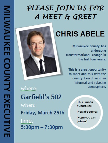 Share: Click to share on Facebook (Opens in new window) Facebook Tweet Click to email a link to a friend (Opens in new window) Email Click to print (Opens in new window) Print Meet & Greet With Chris Abele on March 25th March 19, 2016 Share: Click to share on Facebook (Opens in new window) Facebook Tweet Click to email a link to a friend (Opens in new window) Email Click to print (Opens in new window) Print