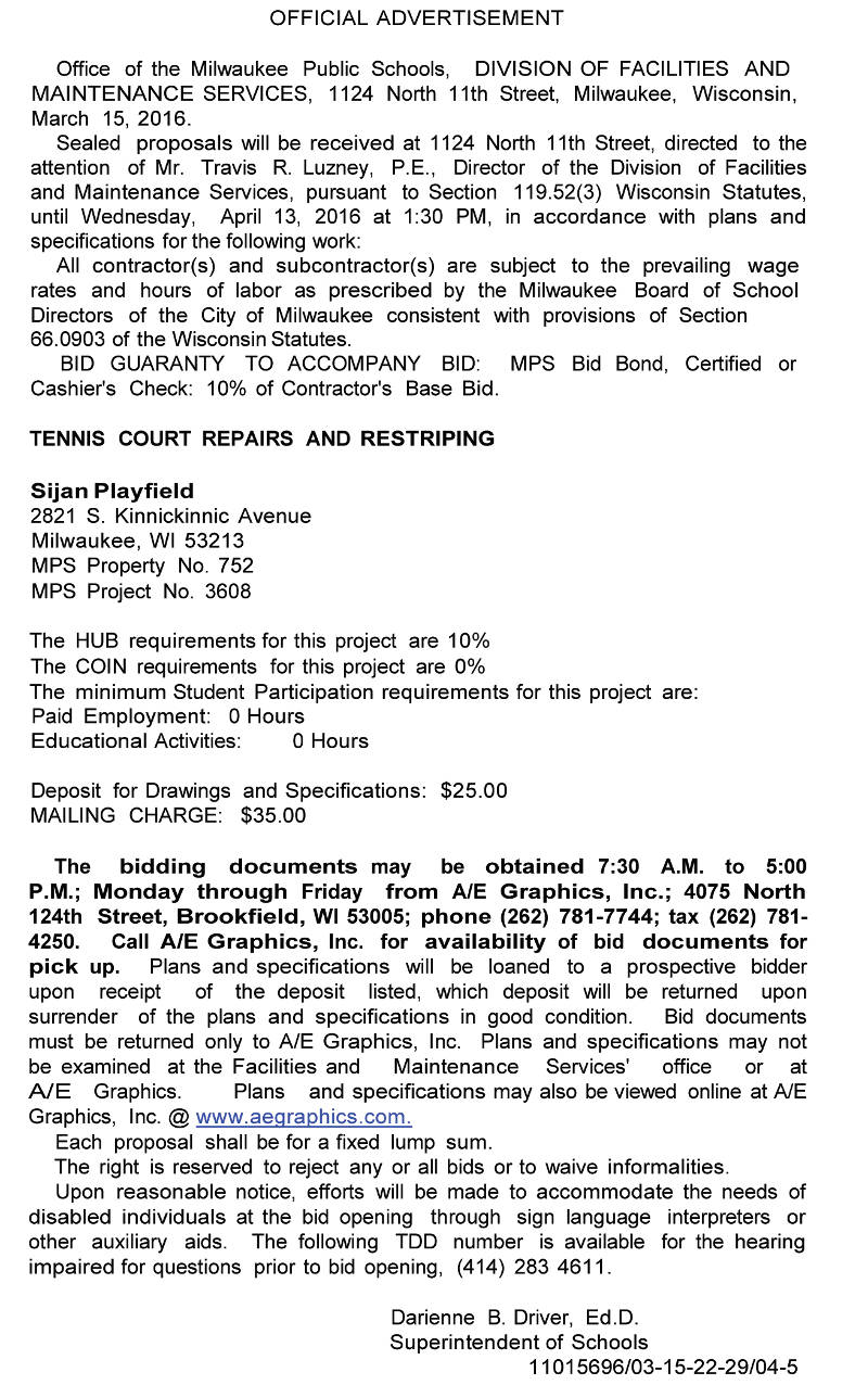Share: Click to share on Facebook (Opens in new window) Facebook Tweet Click to email a link to a friend (Opens in new window) Email Click to print (Opens in new window) Print MPS Requesting BIDs for Tennis Court Repairs and Restriping at Sijan Playfield March 19, 2016 Share: Click to share on Facebook (Opens in new window) Facebook Tweet Click to email a link to a friend (Opens in new window) Email Click to print (Opens in new window) Print