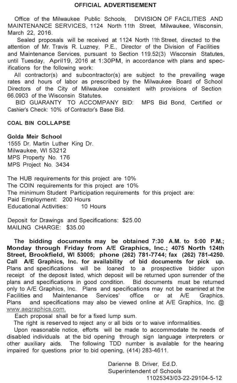 Share: Click to share on Facebook (Opens in new window) Facebook Tweet Click to email a link to a friend (Opens in new window) Email Click to print (Opens in new window) Print MPS Requesting BIDs for Coal Bin Collapse at Golda Meir School March 25, 2016 Share: Click to share on Facebook (Opens in new window) Facebook Tweet Click to email a link to a friend (Opens in new window) Email Click to print (Opens in new window) Print