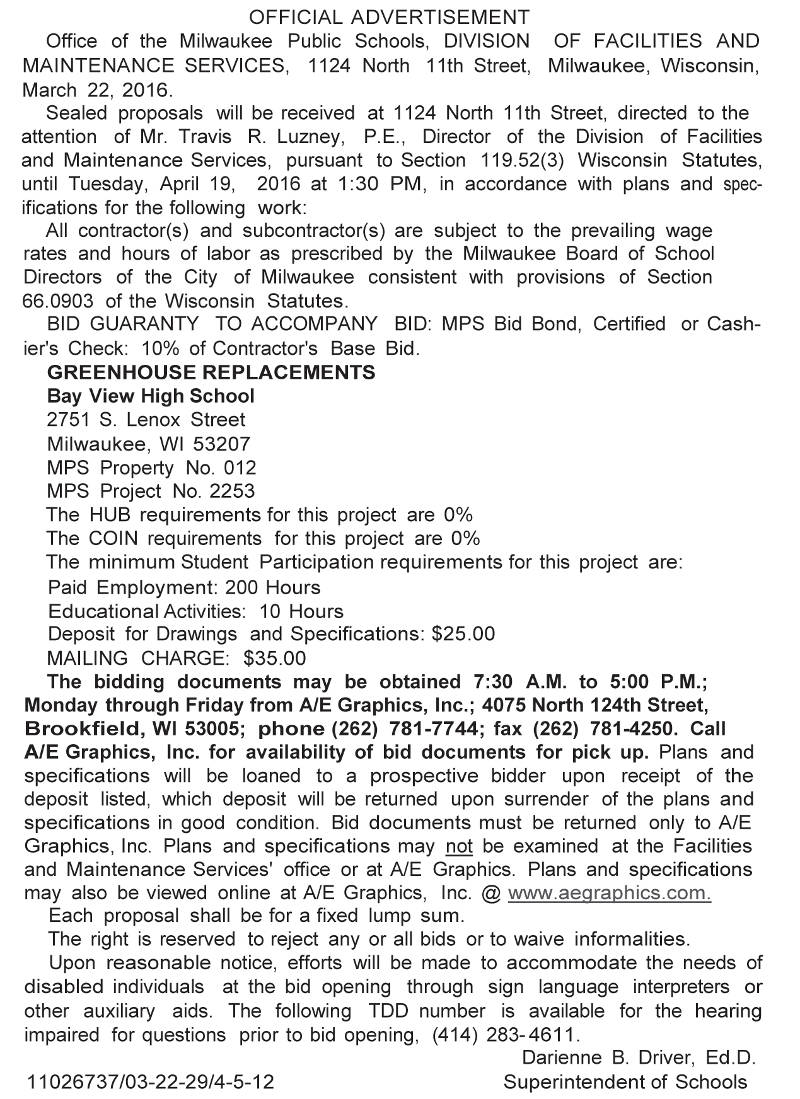 Share: Click to share on Facebook (Opens in new window) Facebook Tweet Click to email a link to a friend (Opens in new window) Email Click to print (Opens in new window) Print MPS Requesting BIDs for Greenhouse Replacements at Bay View High School March 25, 2016 Share: Click to share on Facebook (Opens in new window) Facebook Tweet Click to email a link to a friend (Opens in new window) Email Click to print (Opens in new window) Print