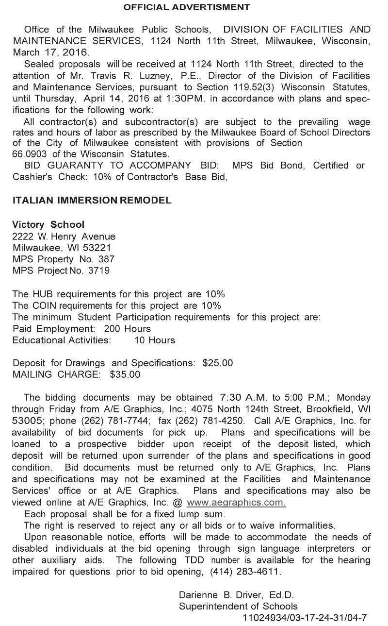 Share: Click to share on Facebook (Opens in new window) Facebook Tweet Click to email a link to a friend (Opens in new window) Email Click to print (Opens in new window) Print MPS Requesting BIDs for Italian Immersion Remodel at Victory School March 25, 2016 Share: Click to share on Facebook (Opens in new window) Facebook Tweet Click to email a link to a friend (Opens in new window) Email Click to print (Opens in new window) Print