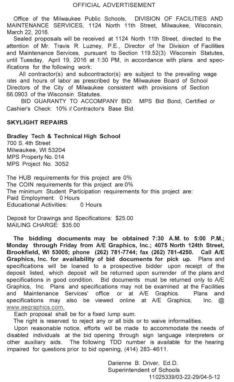 Share: Click to share on Facebook (Opens in new window) Facebook Tweet Click to email a link to a friend (Opens in new window) Email Click to print (Opens in new window) Print MPS Requesting BIDs for Skylight Repairs at Bradley Tech High School March 25, 2016 Share: Click to share on Facebook (Opens in new window) Facebook Tweet Click to email a link to a friend (Opens in new window) Email Click to print (Opens in new window) Print