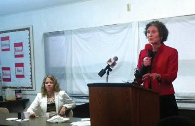 Wisconsin Supreme Court Judge candidate JoAnne Kloppenburg speaks at Community Brainstorming, along with her opponent, Rebecca Bradley. (photo by Mrinal Gokhale.)