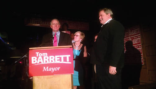 Barrett and his wife arrived at about 9:30 p.m., greeted some attendees and stepped up to the podium to express their gratitude. Behind the couple stood some of Barrett’s employees and campaign volunteers, each holding a sign that said “Tom Barrett for Mayor.“
