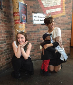 Miss Wisconsin Rosalie Smith (right) hugs a fan during the Toppers “Dough-Nation” night on March 30, a partnership that allowed her to collect 20% of purchases made that night to benefit the COLIN Fund. Photo by Toppers Pizza Milwaukee.