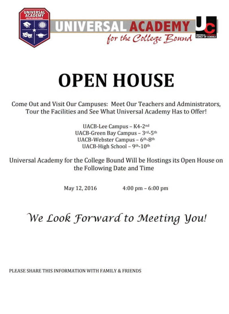 Share: Click to share on Facebook (Opens in new window) Facebook Tweet Click to email a link to a friend (Opens in new window) Email Click to print (Opens in new window) Print Open House May 12 at Universal Academy for the College Bound April 23, 2016 Share: Click to share on Facebook (Opens in new window) Facebook Tweet Click to email a link to a friend (Opens in new window) Email Click to print (Opens in new window) Print