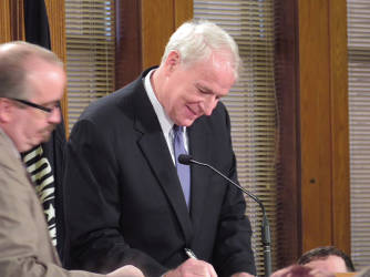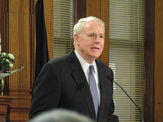 Mayor Tom Barrett addresses the Common Council and the public after his oath of office on Tuesday Photo by Karen Stokes
